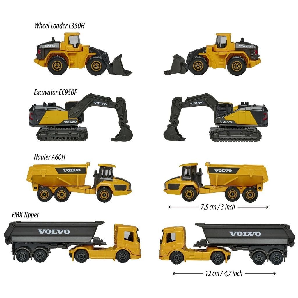 MAJORETTE Volvo 4 Pieces Giftpack 212057287 gồm 4 mô hình phương tiện Volvo: xe máy xúc Wheel Loader L350H, xe cẩu Excavator EC950F, xe ben Hauler A60H và xe tải lớn FMX Tipper.
