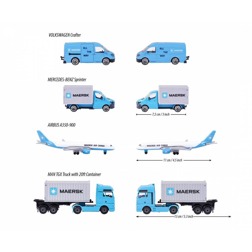 Bộ 4 Xe Mô Hình MAJORETTE MAERSK Giftpack 212057290 – Bao gồm 4 mô hình phương tiện: MAN Truck, Mercedes-Benz Sprinter, Volkswagen Crafter & Airbus Airplane). Đồ chơi cho trẻ từ 3 tuổi trở lên.