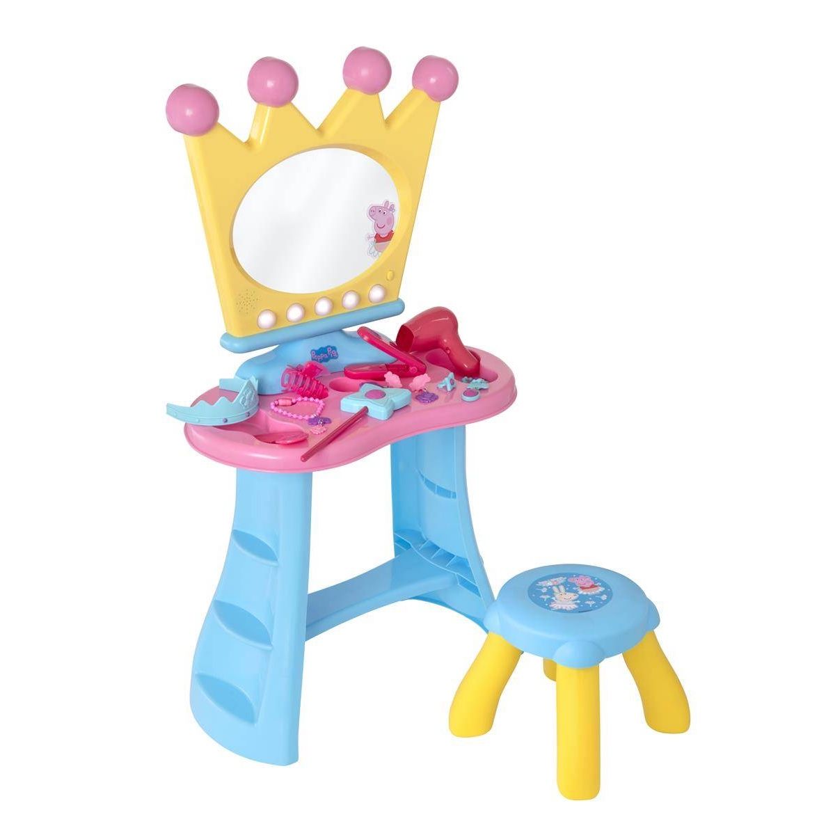 Chiếc bàn xinh xắn với màu sắc vàng xanh với gương phát sáng hình vương miện. Bé chỉ cần ấn nút, giai điệu Peppa Pig quen thuộc sẽ cất lên. Các phụ kiện tạo nên sự xinh tươi của các bé gái bao gồm máy sấy tóc chạy bằng pin, máy duỗi tóc, kẹp tóc, vương miện, đũa phép thuật và đồ trang sức. Máy sấy phát ra âm thành như thật, tạo trải nghiệm mới lạ cho bé