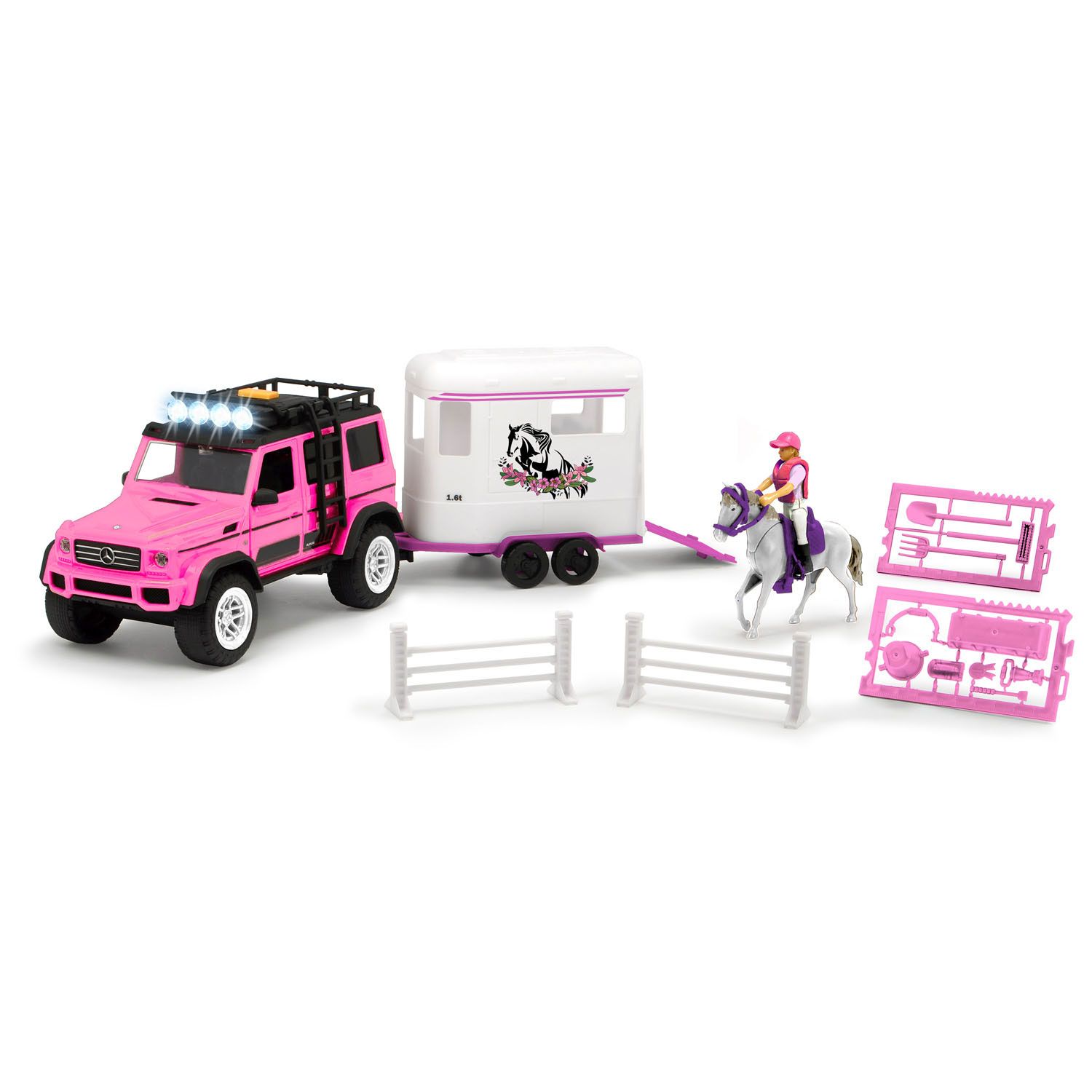 Đồ chơi dùng pin.Bộ Đồ Chơi Xe DICKIE TOYS Playlife-Horse Trailer Set Pink mang đến niềm vui bất ngờ dành cho bé. Sản phẩm bao gồm 1 xe Mercedes-Benz G 500 4 × 4² và rất nhiều phụ kiện đi kèm. Các vật dụng cho môn cưỡi ngựa được bổ sung đầy đủ trong bộ đồ chơi: thùng, xẻn, cào... DICKIE TOYS Playlife-Horse Trailer Set Pink được thiết kế với tỷ lệ 1:24 phù hợp với trẻ em từ 3 tuổi trở lên.