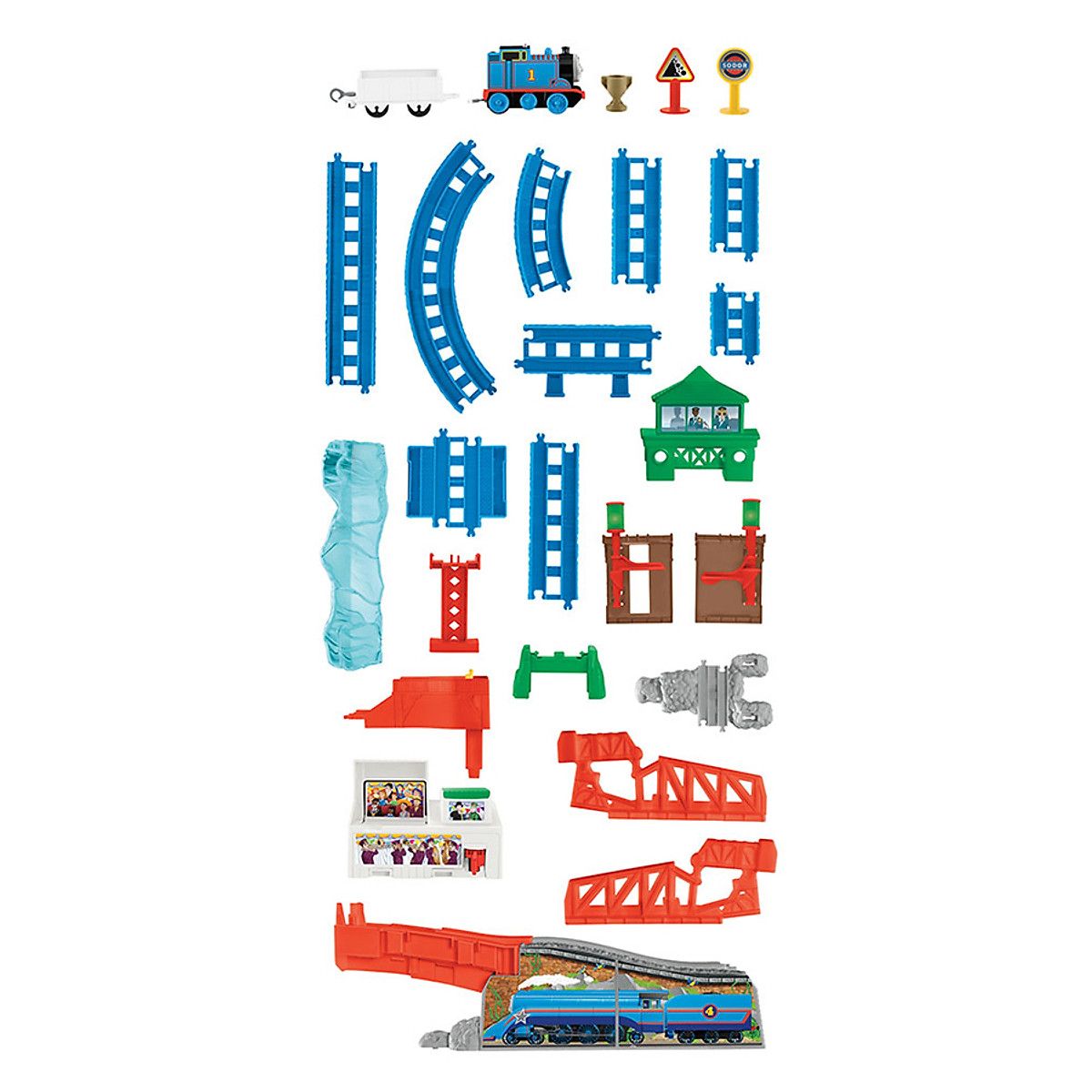 Các loại đường ray khác nhau, phần cầu tách rời để Thomas nhảy qua gồm nhiều đoạn đường ray thẳng và khúc cua.