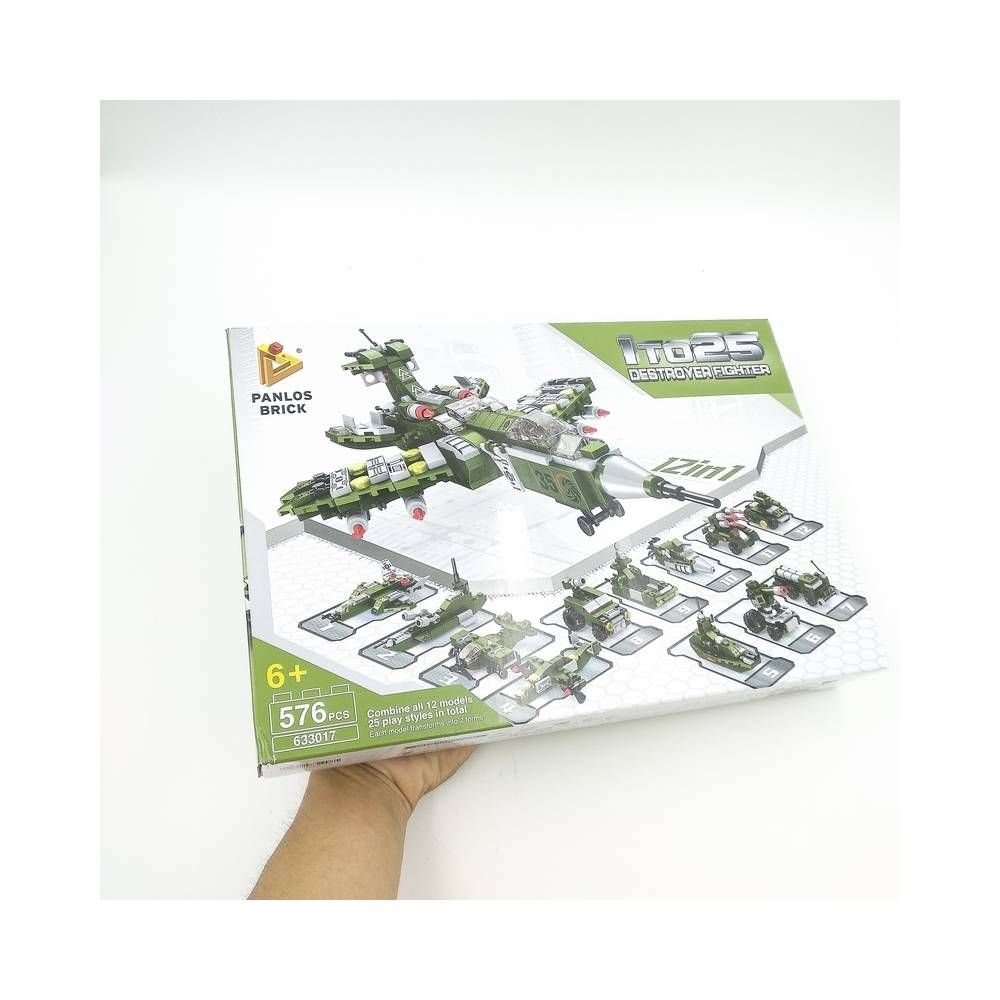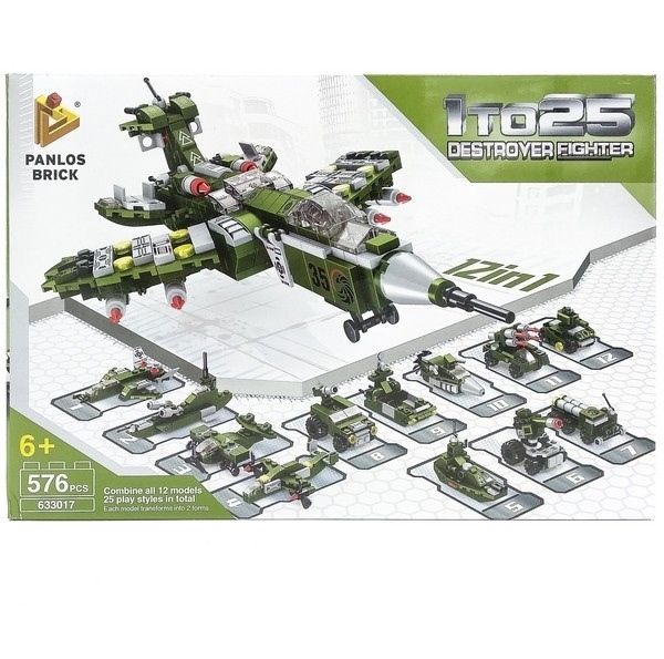 Sản phẩm gồm 12 hộp nhỏ, mỗi bộ ghép thành 1 loại phương tiện chiến đấu quân đội. Khi ghép 12 hộp lại có thể lắp ghép thành một chiến đấu cơ lớn dành cho các bé!