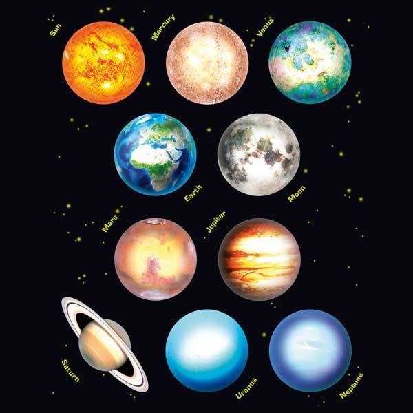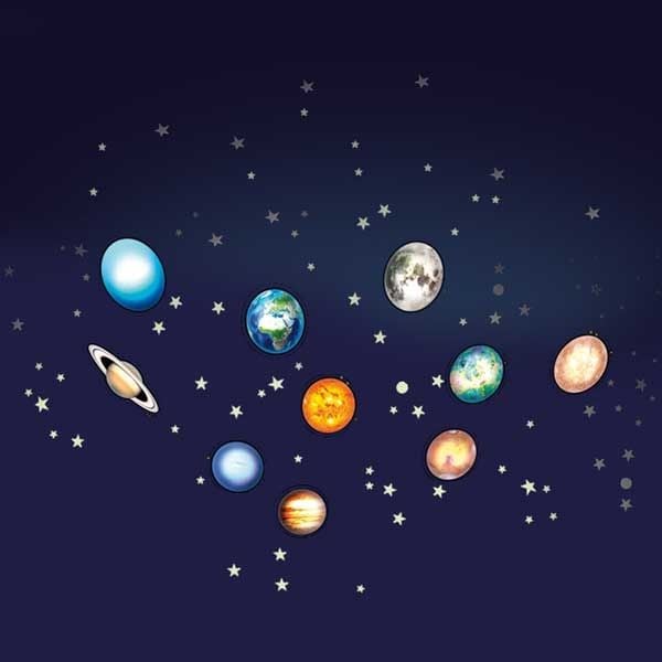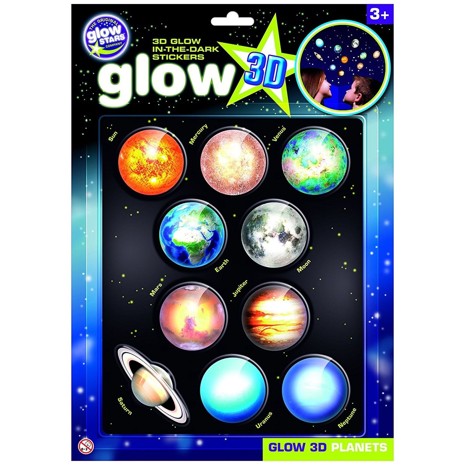 Hình dán 3D phát sáng trong bóng tối của Công ty Original Glowstars của 11 hành tinh. Vào ban ngày, chúng là đồ trang trí trong phòng đầy màu sắc và đến đêm, chúng sẽ sáng lên và tạo ra một màn hình rực rỡ. Tuyệt vời để tìm hiểu về các hành tinh và bầu trời đêm. Tự dính.