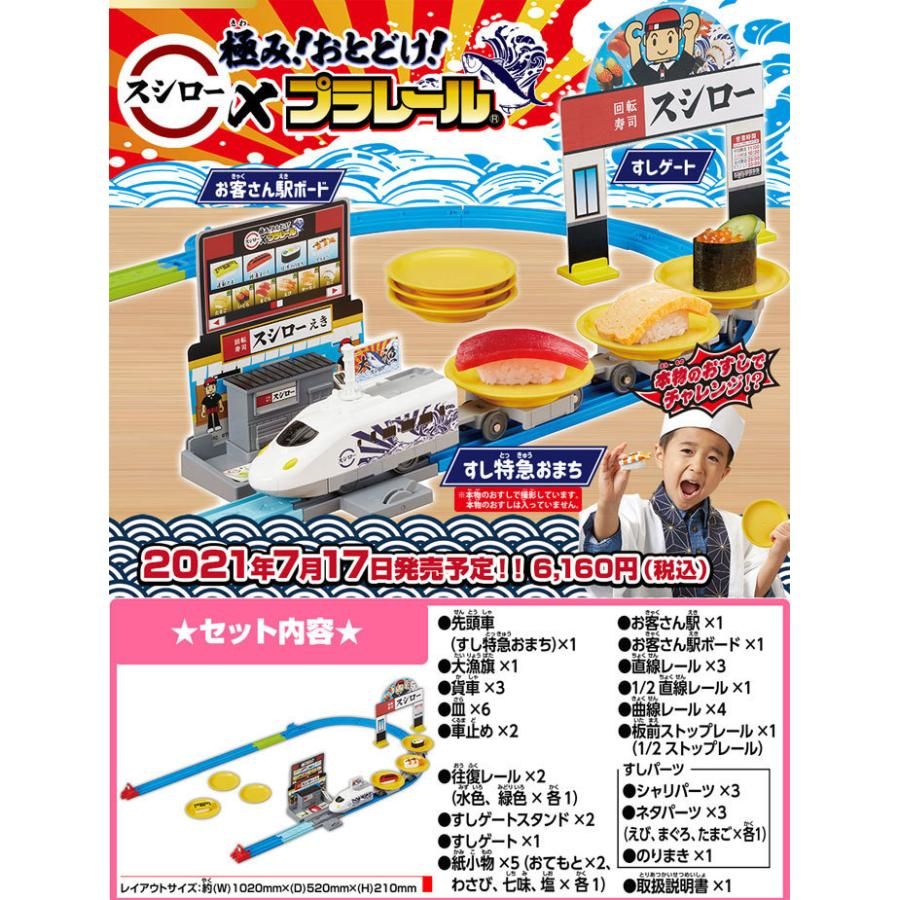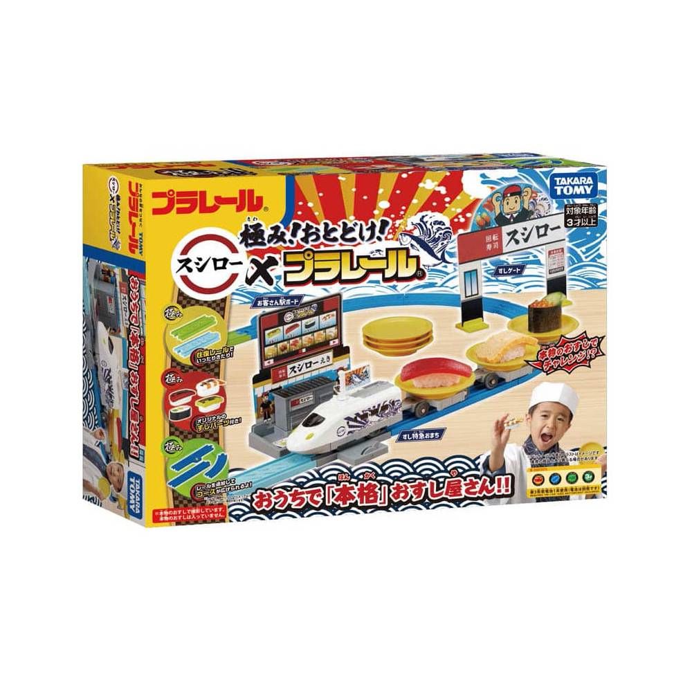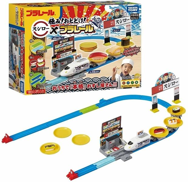 Bộ đồ chơi bao gồm 4 loại sushi (norimaki, tôm, cá ngừ, trứng) / 6 đĩa / 3 toa chở hàng / bao gồm đường ray dừng Itamae / ga khách / cổng sushi Nếu bạn kết nối các đường ray khác với bộ, bạn có thể mở rộng các đường ray của Plarail.