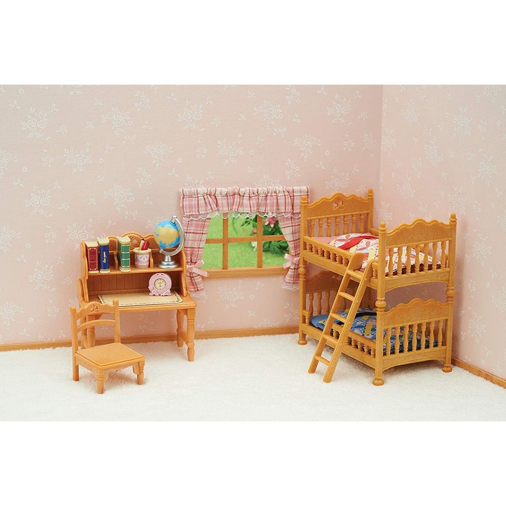 EP-5338 Sylvanian Families Phòng Ngủ Children's Bedroom Set bao gồm giường và bàn để tạo phòng ngủ cho trẻ. Bộ sản phẩm có các giường có thể tách rời và sử dụng riêng lẻ hoặc cùng nhau như một giường tầng. Sách và một quả địa cầu được bao gồm và quả địa cầu có thể được quay xung quanh. Giá đỡ phía trên bàn làm việc có thể được tháo rời để tạo thành một chiếc bàn làm việc đơn giản hơn. Kết hợp với các hình và bộ đồ nội thất khác từ loạt phòng dành cho trẻ em cho phép chơi giả vờ thú vị hơn nữa (được bán riêng).