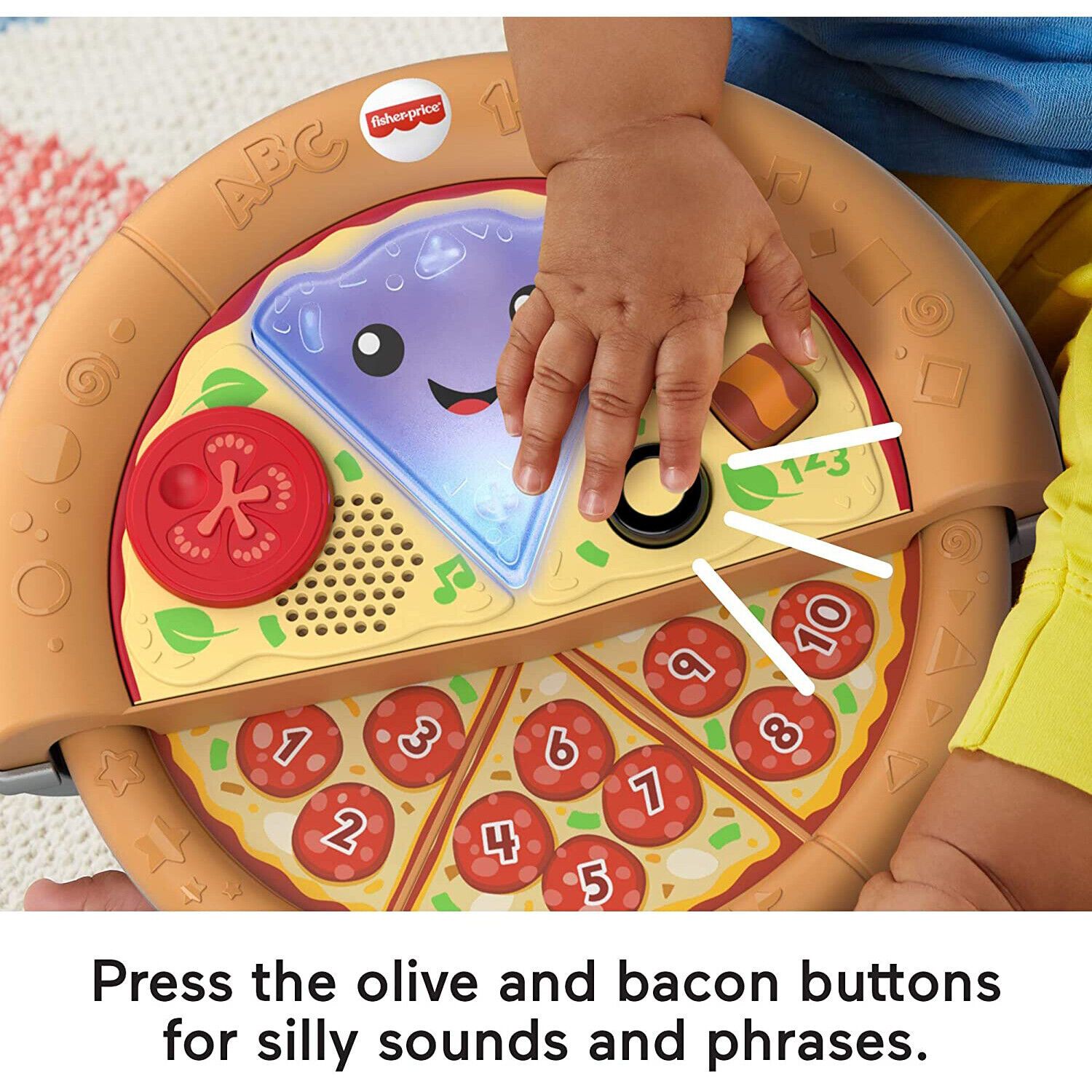 Một chiếc bánh pizza dành riêng cho trẻ nhỏ, với tất cả các lớp trên bề mặt yêu thích của chúng: pho mai, pepperoni! Với đồ chơi Pizza Cười & Học Slice of Learning, trẻ sơ sinh và trẻ mới biết đi có thể ở trong đó, lấy một lát và học tất cả về số đếm, các mặt đối lập và các hình dạng thông qua trò chơi thú vị và thú vị. Đồ chơi học tập âm nhạc này có một khuôn mặt đáng yêu, các lát bánh có thể trượt với pepperoni được đánh số và hai nút trên cùng cho các bàn tay nhỏ nhấn và di chuyển để kích hoạt đèn và âm nhạc. Các hoạt động bận rộn như quay quả cà chua và trượt những lát bánh pizza giúp củng cố các kỹ năng vận động tốt của em bé, trong khi các bài hát và cụm từ thú vị giới thiệu các con số.