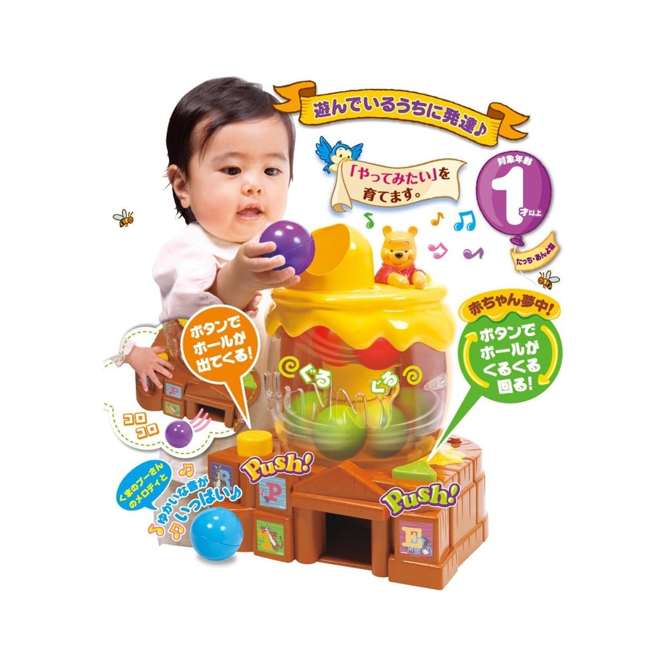 Hộp thả ống đa năng Cây mật ong gấu Pooh gồm 4 quả bóng với các màu sắc khác nhau giúp bé dễ nhận biết phát triển thi giác. Cùng với nó là một bộ hộp thả khối được thiết kế như một hũ đựng mật ong ngọt ngào, hấp dẫn. Khi bé thả bóng vào lỗ, các nút hình khối khác nhau giúp bé có được những nhận thức cơ bản về hình học. Bộ thả ống chạy bằng pin, phát ra những âm thanh rất vui tai sẽ giúp cho bé phát triển thính giác rất tốt.