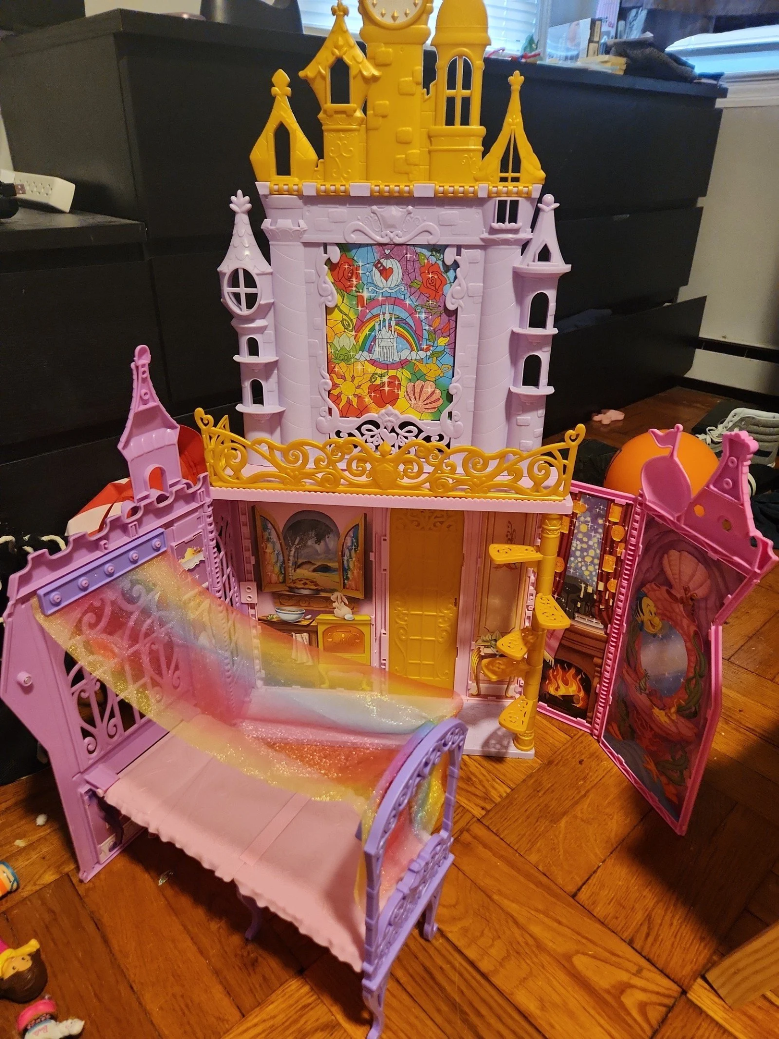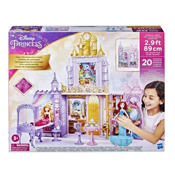 Lâu đài Công chúa Disney cao 90 cm hùng vĩ có thể gập lại. Đi cùng với tay cầm để mang theo trong các cuộc đi chơi, kỳ nghỉ . Bên trong Lâu đài công chúa Disney Princess Fold N Go Celebration Castle có một chiếc giường có màn trang trí và 20 phụ kiện, bao gồm một bàn và 2 ghế, thìa, dĩa, cốc, xoong. Thậm chí còn có một miếng bánh nữa đó!