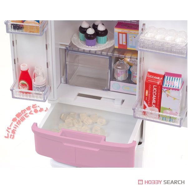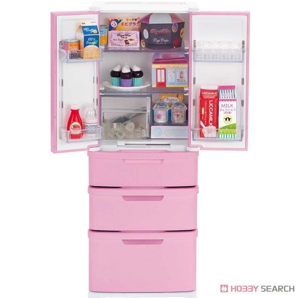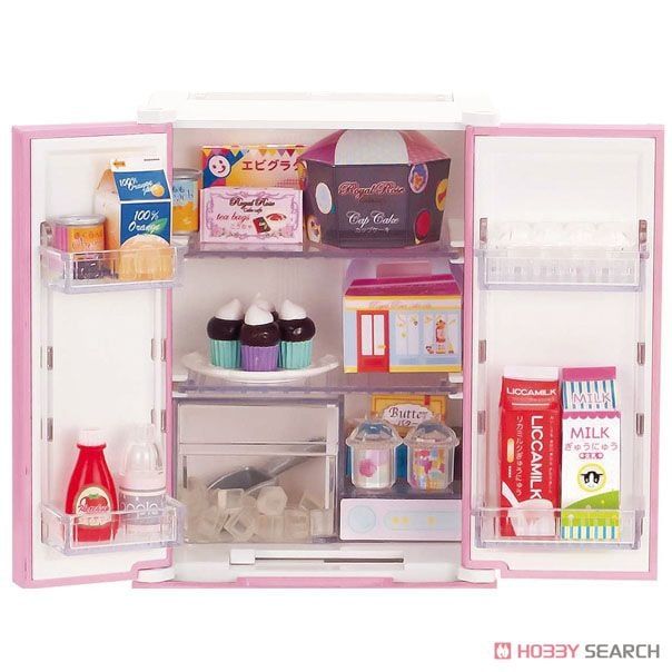Tủ lạnh 5 ngăn có sẵn đá lạnh cho búp bê Licca. Vật dụng đáng yêu cho các em nhỏ yêu thích chơi búp bê. Sản phẩm bao gồm các thức ăn đóng hộp, kem, sữa, đá lạnh...