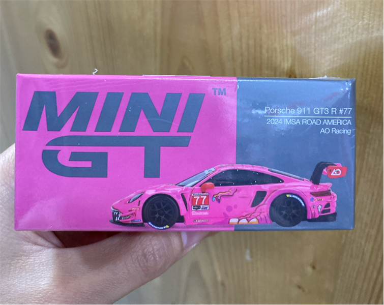 Mini GT BOX version MGT01052 Porsche 911 GT3 R #77 AO Racing 2024 IMSA ROAD AMERICA