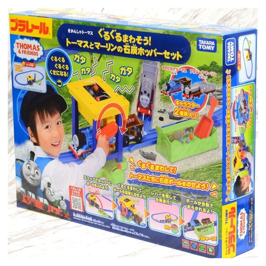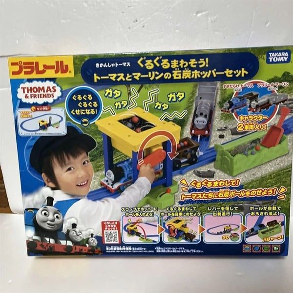 Bạn có thể dừng xe điện (Thomas) bằng đường ray dừng. · Khi bạn đặt một quả cầu than vào phễu chứa than và quay tay lái, nó sẽ được vận chuyển đến đầu vào và có thể cung cấp than cho xe chở hàng. · Khi xe đến nơi chứa rác, các viên than đều được hạ xuống. · Múc các viên than từ kho chứa rác, ở trên đỉnh của phễu than một lần nữa và chơi tiếp. · Thomas (xe máy) với khuôn mặt lem luốc, 2 nhân vật Marlin (vô lực lăn tay) của ba ống khói đang hoạt động trong phim. ※ Merlin có thể chơi với những chiếc ô tô được hỗ trợ khác như James. · Với đường ray và cảnh tất cả trong một bộ, bạn có thể chơi ngay lập tức.
