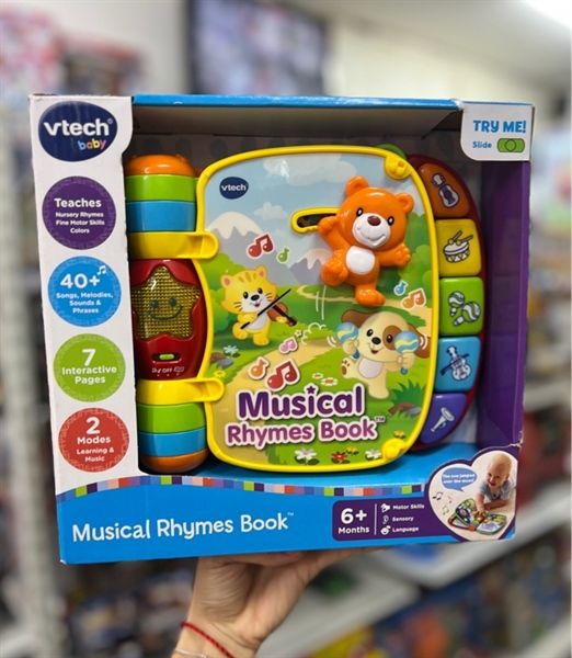 Cuốn sách âm nhạc Musical Rhymes Book của VTech mang đến cho bé trải nghiệm vừa học vừa chơi qua những bài đồng dao kinh điển. Với thiết kế đầy màu sắc, âm thanh vui nhộn và các chi tiết có thể xoay, trượt, bé sẽ hứng thú khám phá từng trang sách ngay từ lần đầu cầm trên tay.