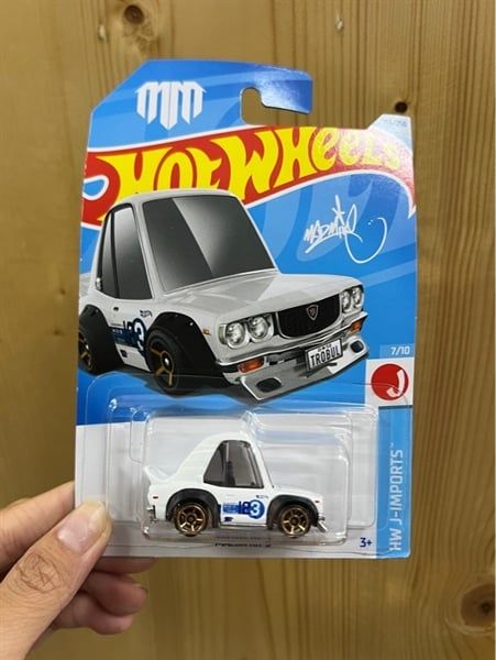 Mô hình Hot Wheels Mazda RX-3 HXR23 phiên bản màu trắng thuộc dòng J-Imports năm 2024, mang phong cách “Tooned” với thiết kế ngộ nghĩnh, phù hợp cho người sưu tầm yêu thích xe JDM và mô hình độc đáo.
