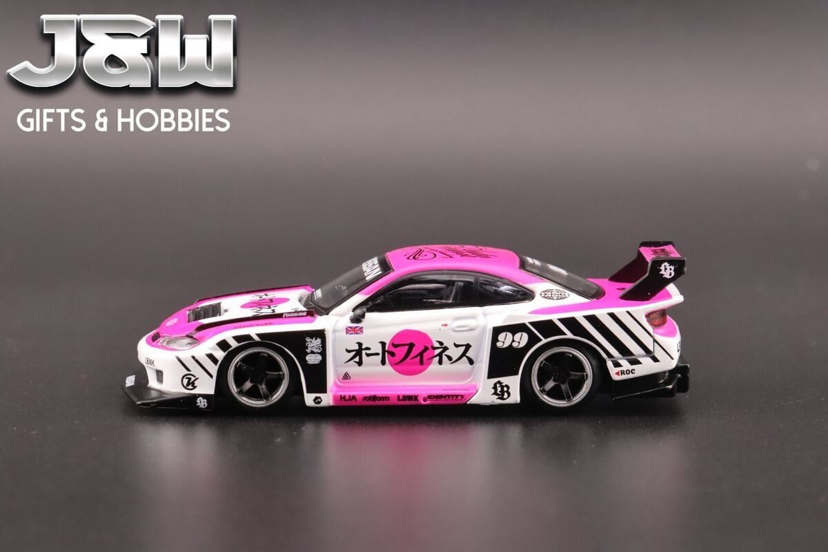 Mô hình tĩnh tỉ lệ 1:64 của chiếc Nissan Silvia S15 với bộ bodykit LB-Super Silhouette, mang phối màu trắng – hồng đặc trưng của Auto Finesse tại SEMA 2023. Phiên bản tay lái bên phải (RHD), chi tiết sắc nét, phù hợp cho người sưu tầm yêu thích JDM và xe độ.