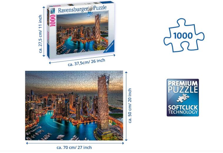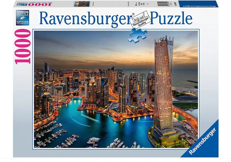 Xếp hình Ravensburger Dubai Marina at Night 1000 miếng là hình ảnh bến cảng hào nhoáng của Dubai vào ban đêm. Ánh sáng lấp lánh từ vô số ô cửa sổ, ánh sáng đường phố phản chiếu trên làn nước trong xanh và kỹ thuật chụp ảnh phơi sáng lâu biến những con thuyền đang di chuyển thành những "nét vẽ" nghệ thuật trên khắp bến cảng. Những tông màu phong phú, những tòa nhà chọc trời đáng kinh ngạc, những chùm ánh sáng và bầu trời tĩnh lặng mang đến cho những người hâm mộ bộ môn giải đố rất nhiều thử thách trên đường đi.